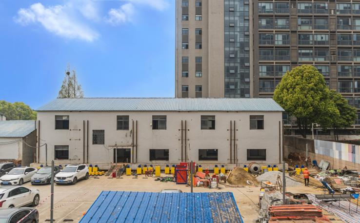本工程试验于2023年实施。巨成公司总部园区内一栋两层砌体结构楼,用该建筑进行群控同步顶升工程试验,试验用一个群控站控制三个集控站,每个集控站控制8个数控泵站,驱动32个液压千斤顶。总共控制24个数控泵站,驱动96个液压千斤顶,将砌体结构顶升两层,第一层5.1m,第二层4.2m,向上整体顶升9.3m,历时三个月。同步的误差小于1mm,试验取得圆满成功,该试验是全世界首次使用钢滑道顶升技术进行的试验,把顶升工程变为100%的安全,造价只有传统方法的十分之一,并且比传统的顶升速度快了4倍。