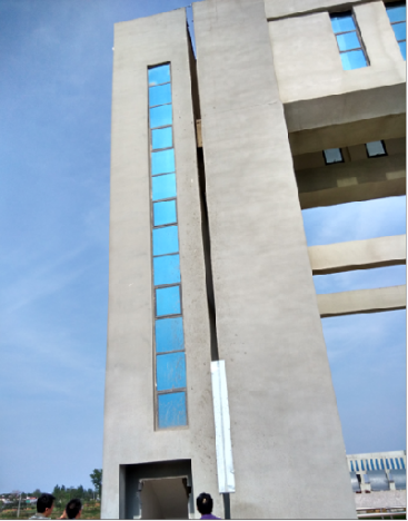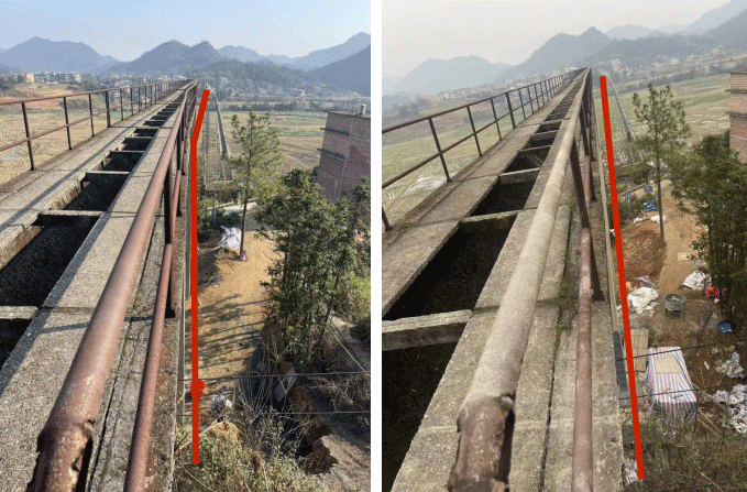 其中潦河渡槽进口右岸楼梯间占地面积为6.4m×2.2m,高14.11m,为三层框架结构,小型C25钢筋混凝土扩大基础,尺寸为5.4m×2m×0.5m。草墩河渡槽出口左岸楼梯间占地面积为6.4m×2.2m,高14.11m,为三层框架结构。小型C25钢筋混凝土扩大基础,尺寸为3.8m×1.8m×0.5m。右侧楼梯间向下游侧倾斜变形19.8cm,沉降16.2cm,左侧楼梯间向外侧倾斜变形19cm,沉降4.6cm,楼梯间周围部位出现不同程度沉降变形迹象。