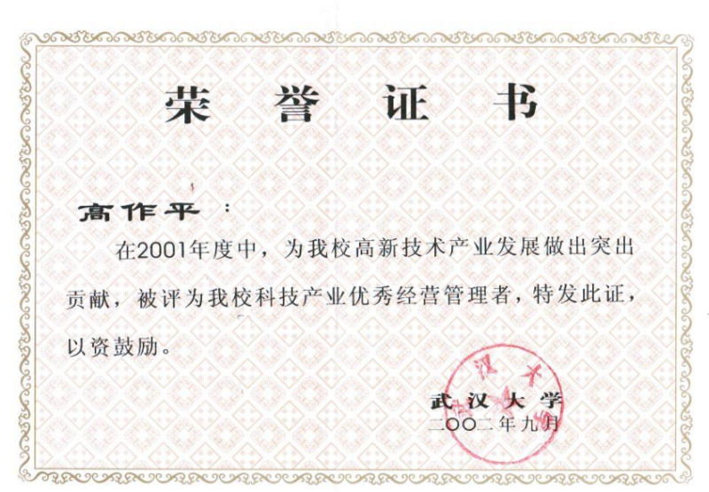 2001年度武汉大学“科技产业优秀经营管理者”