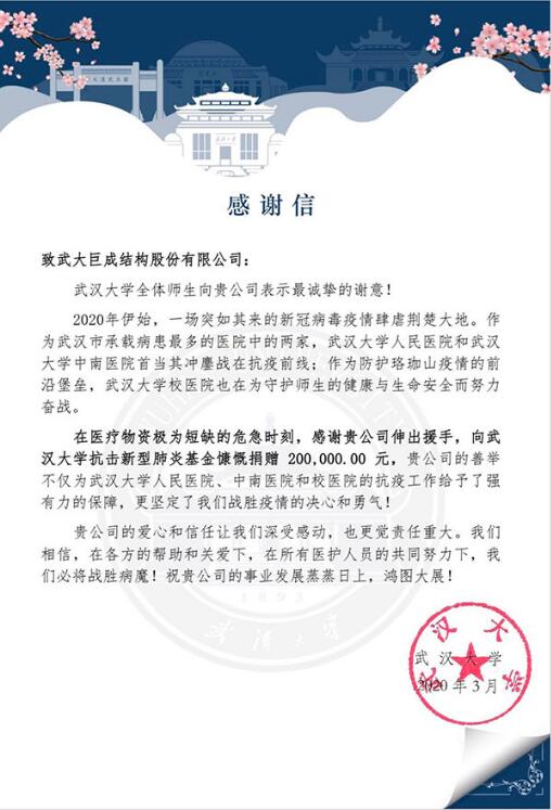 2020年向“武汉大学抗击新型冠状病毒感染肺炎基金”捐款20...