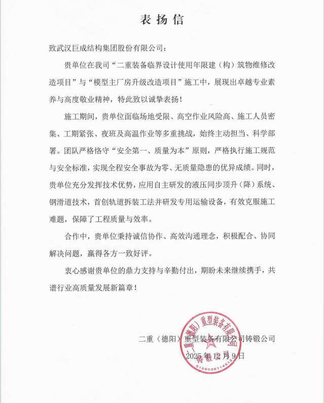 2025年二重(德阳)重型装备有限公司 表扬信