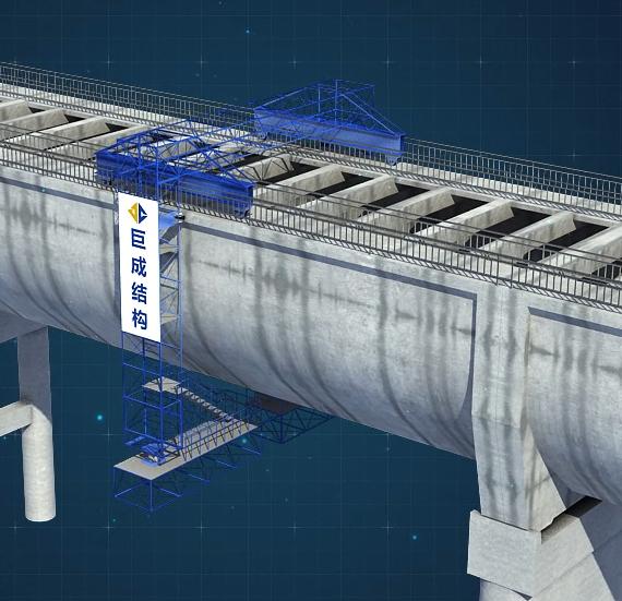 巨成渡槽检修架车通过移动式平衡梁配合可伸缩式竖向垂直桁架,能够使工作平台沿平面及纵向两个方向进行移动;竖向垂直桁架内侧设有人员上、下通道及作业平台。随着检修架车的移动,工作人员可逐步对渡槽槽身、槽墩进行全面检测和维修加固。同时,工作平台设计为可回转形式,遇到槽墩等障碍物时可快速进行回转运动,检修架车便能连续行走作业。另外,侧向限位装置通过可调节弹簧,能够确保检修架车整体与渡槽槽身卡紧,保证了检修架车在行进过程中的安全性。