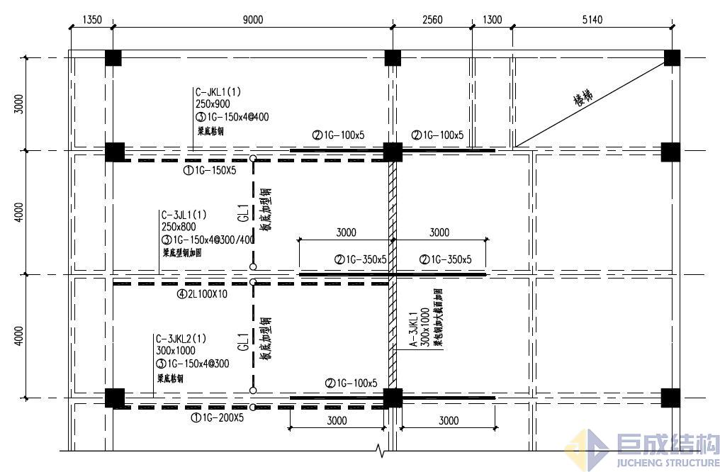 2)粘结型钢改变传力途径加固法:适用于原结构楼面荷载大幅度提高或增加较大局部荷载,通过在板底粘型钢改变传力途径或减小跨度提高楼板承载力;