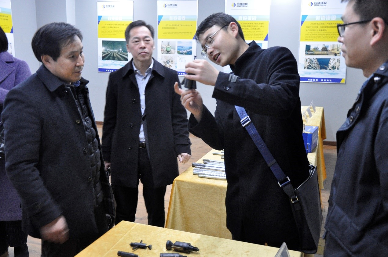公司董事长高作平教授率领公司全体领导陪同两大设计院的各位来宾参观巨成4楼企业文化展示厅,用视频、图片、实物的形式向各位来宾详细介绍了巨成的企业发展历程、企业文化、各项专利技术及应用等,其中重点介绍了公司的扩孔自锁锚固产品和顶升增层改造技术。