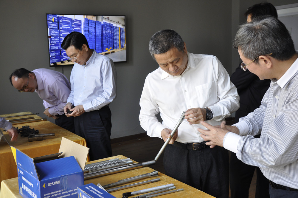 钮新强院士、谢先启院士、陈建兵教授参观自锁锚固产品展示厅