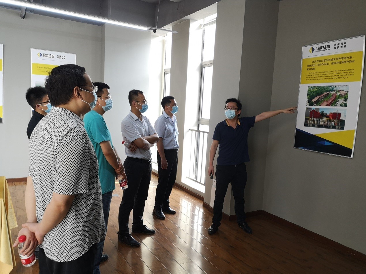 正华设计一行首先参观了巨成公司的顶升试验,试验负责人张畅、周志勇详细介绍了试验的过程和创新之处。随后王总一行参观伟德国际1946bv官网的展厅,详细了解巨成的发展历程、企业文化、综合实力、创新技术等。