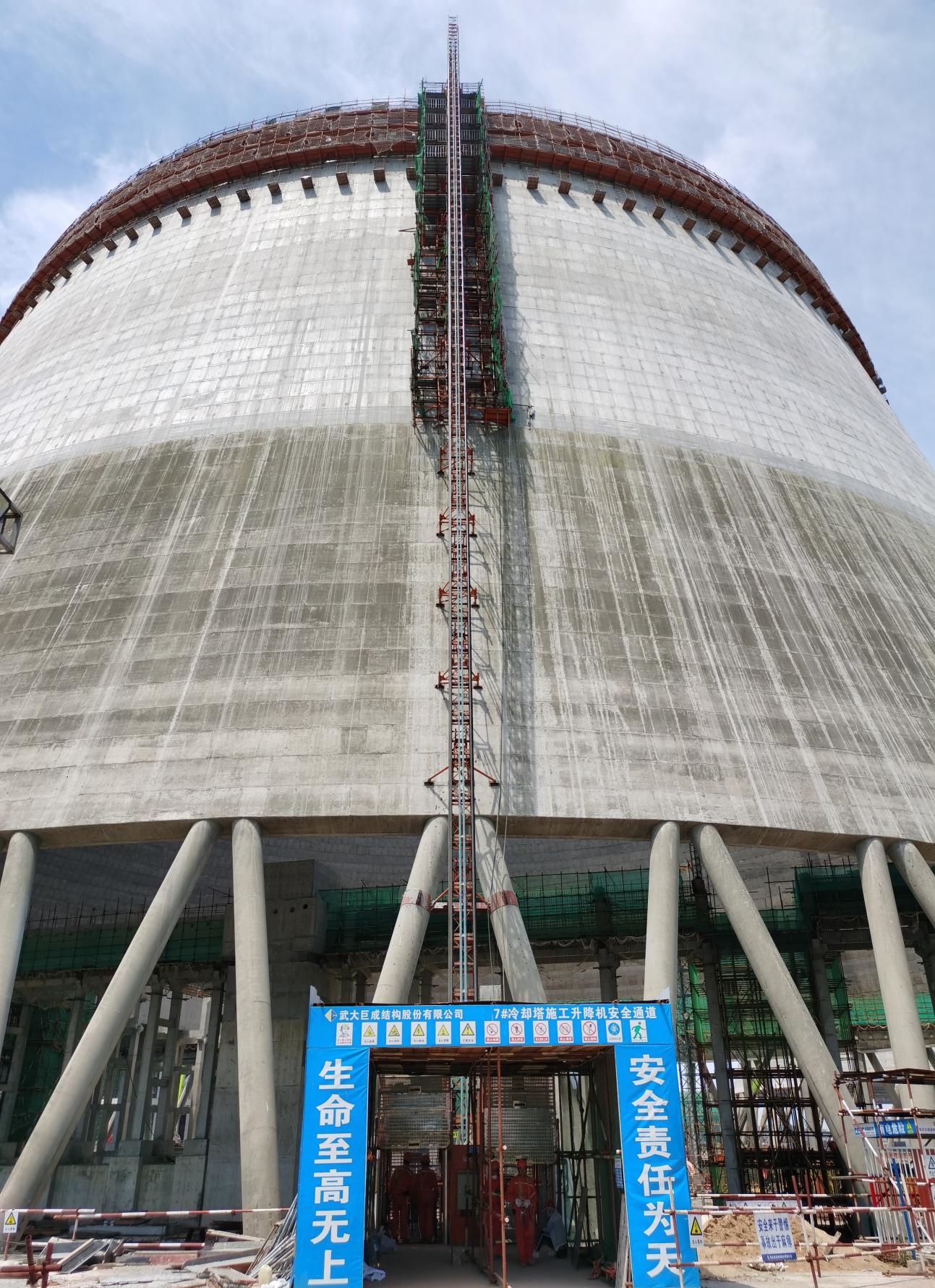 丰城电厂7#冷却塔因发生过特大安全生产事故,为各方所关注。2020年复工后,伟德国际1946bv官网凭借过硬的技术实力,荣誉承接了冷却塔筒壁设计与加固工程。该工程属于高危项目,开工前,伟德国际1946bv官网的设计方案和施工组织设计均通过了专家论证。其中采用的多项巨成专有技术也得到了各位专家的认可,如:扩孔自锁锚固技术保证新旧混凝土紧密结合、补偿收缩细石混凝土保证施工质量、便携式钢平台保证施工安全、曲线施工升降机保证垂直运输。