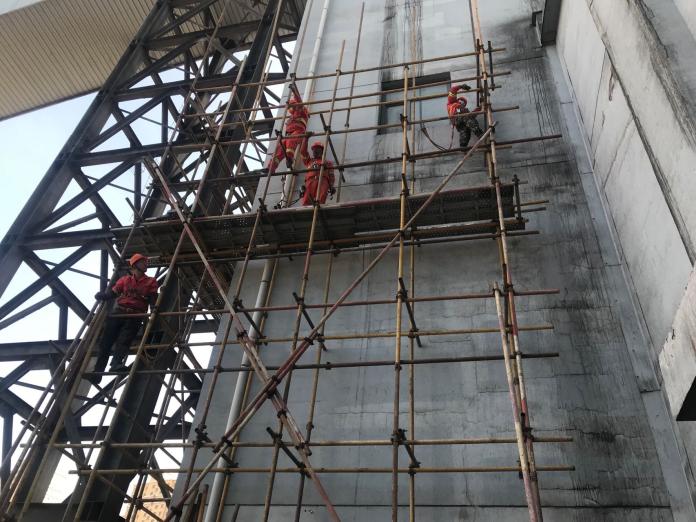 烟囱改造属于超危项目,需要在离地50米的高处搭设钢管架。施工区域地势空旷、风力强劲,所有施工人员严格遵守高处作业安全规定,做好自我防护,注意“四不伤害”,不野蛮施工,不冒险施工,克服侥幸心理,合理安排工作。在大家的共同努力下烟囱外架已经顺利搭设完成,赢得了电厂的一致认可与好评。