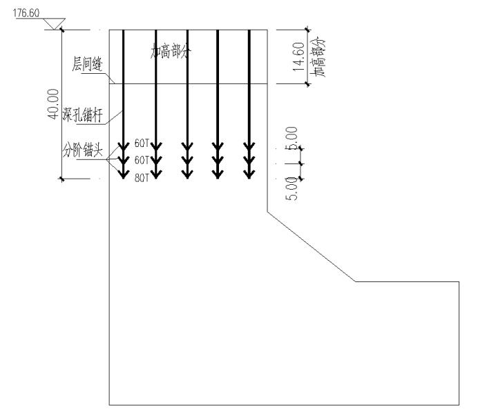 根据设计,闸墩新增1000吨预应力根据计算每个闸墩增加1000吨预应力,长度45m,每个闸墩5孔,每孔200吨。内锚头分为3层,3层内锚头上下分布间距间隔5m,底层80吨,上面两层各60吨。