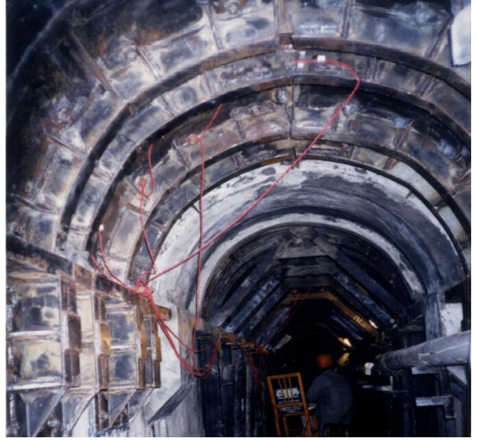 电站运行一段时间后,现场发现预制混凝土拱顶出现了沿廊道轴向方向的纵向裂缝,预制拱与现浇边墙交接处混凝土出现剥落,这对廊道的安全运行构成了威胁。最后采用巨成公司自锁锚杆将加固用钢板进行锚固,场地解决问题。本项目2000年实施,使用自锁锚杆4.6万只,是扩孔自锁锚杆的第一次大规模应用。