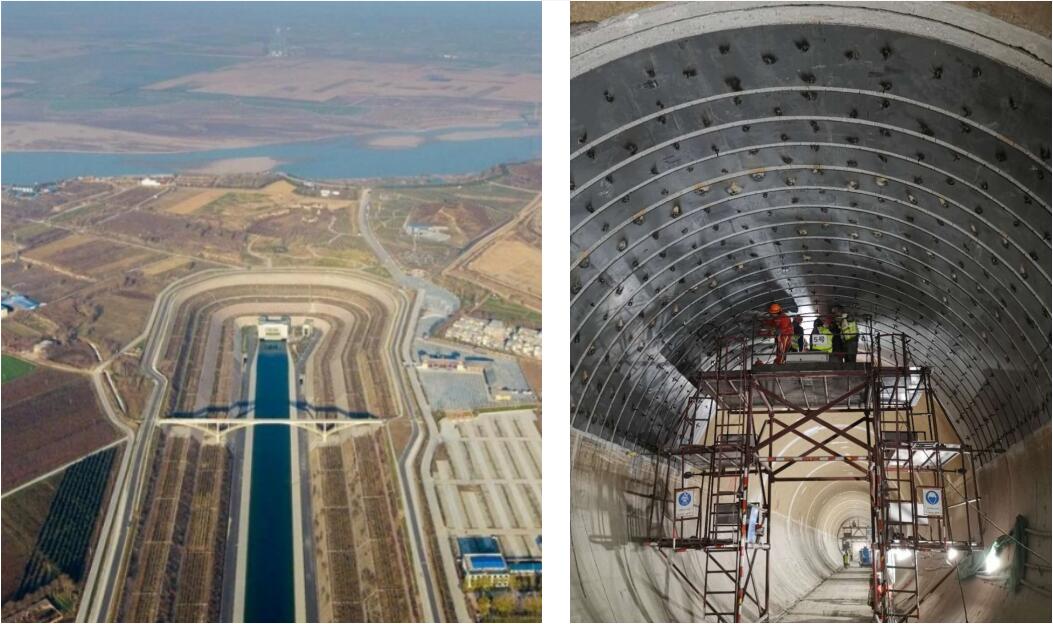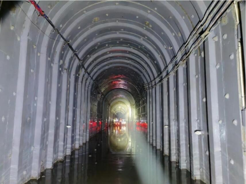 穿黄工程位于河南省郑州市黄河上游约30km处,线路总19.30km,主体工程由南、北岸渠道、南岸退水洞、进口建筑物、穿黄隧洞、出口建筑物、北岸防护堤、北岸新、老蟒河交叉工程,以及孤柏嘴控导工程等组成。其中最引人瞩目的也是难度最大的穿黄隧洞,单洞长4250m,包括过河隧洞和邙山隧洞,其中过河隧洞段长3450m,邙山隧洞段长800m,隧洞采用双层衬砌,外衬为预制钢筋混凝土管片,内径7.9m,内衬为现浇预应力钢筋混凝土,成洞内径为7.0m。隧洞为双洞平行布置,中心线间距为28m,各采用1台泥水平衡盾构机自黄河北岸竖井始发向南岸掘进施工。穿黄隧洞最大埋深35m,最小埋深23m;断面最大水压为4.5MPa。南水北调中线工程2014年12月12日正式通水,至2019年已运行近5年,考虑到穿黄隧洞的重要性,在保证中线干线工程正常通水的情况下,计划安排在冬季输水量较小时开展单洞停水检查维护工作,本次对A洞进行检查维护。