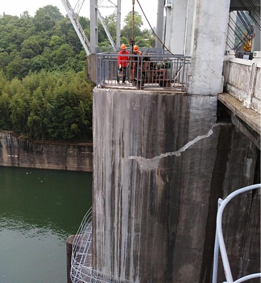 西洱河梯级电站拦河坝泄洪冲砂底孔闸墩于1991年洪水前发现竖向裂缝和水平裂缝,两孔闸墩裂缝均以闸孔中心线为中心轴呈基本对称。中墩竖向裂缝已经左右贯通;两个边墩的竖向裂缝均未贯通,裂缝深度约30cm;水平裂缝均未贯通,其深度约为25cm左右。