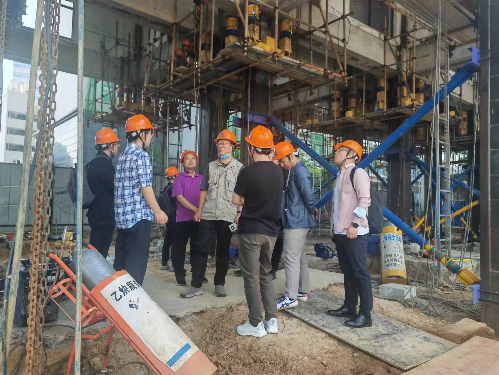 在巨成钢滑道群控同步顶升工程试验项目现场,研究院院长助理周志勇对钢滑道群控同步顶升试验的背景和目的进行了介绍,对该技术的安全性、高效性、经济性等特点进行说明,双方对钢滑道顶升技术应用场景展开了热烈讨论,并就试验过程中的相关技术要点进行了深入交流。