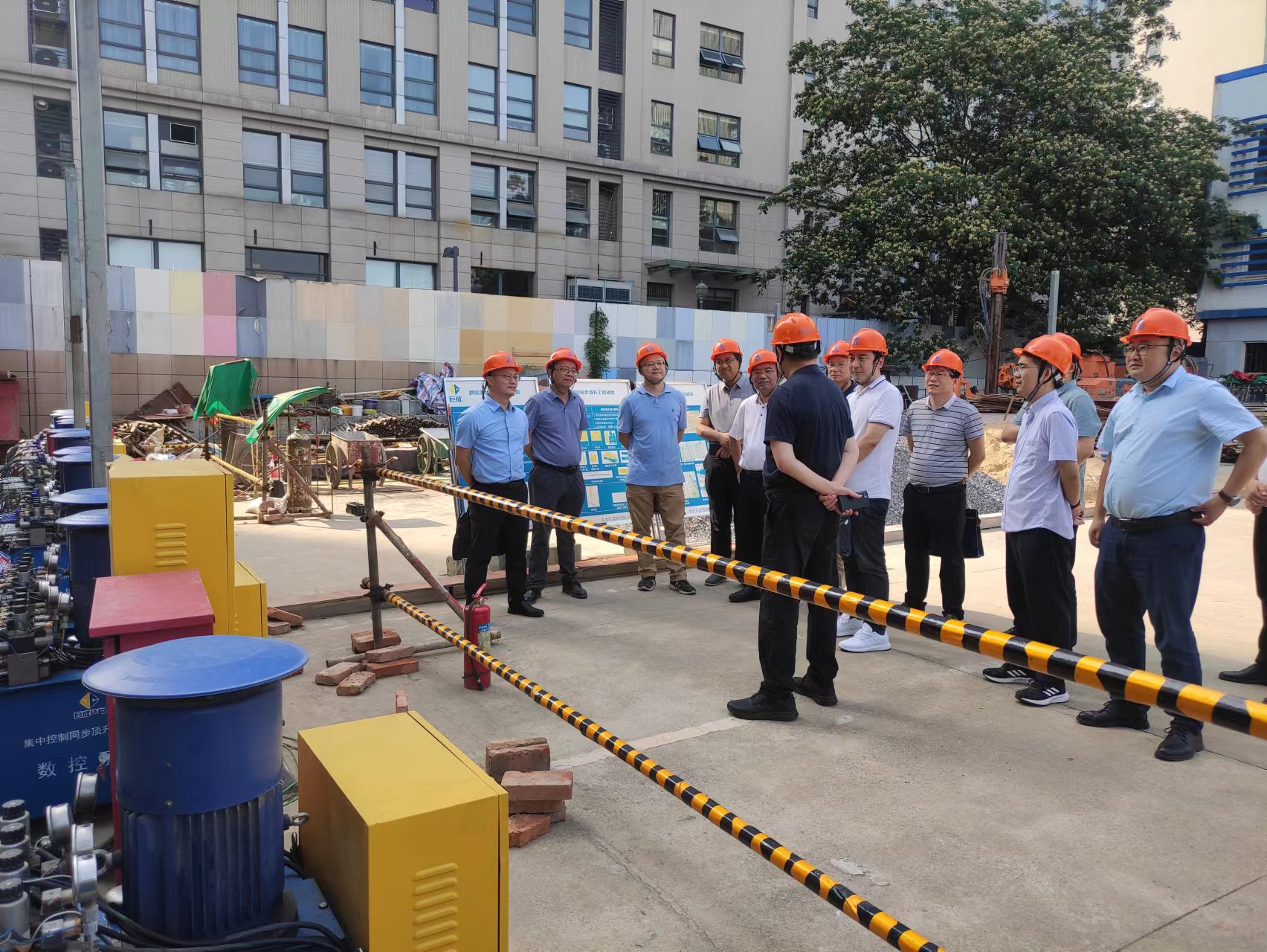 陈总一行首先考察了巨成群控同步顶升工程试验项目现场,副总经理张畅介绍了顶升试验的背景、目的和群控同步顶升大型数控设备以及顶升应用前景。双方对钢滑道顶升技术和应用场景展开了深入的讨论和交流,大家一致认为巨成群控同步顶升技术能够在城市更新、老旧小区改造以及桥梁顶升等领域发挥重大作用。