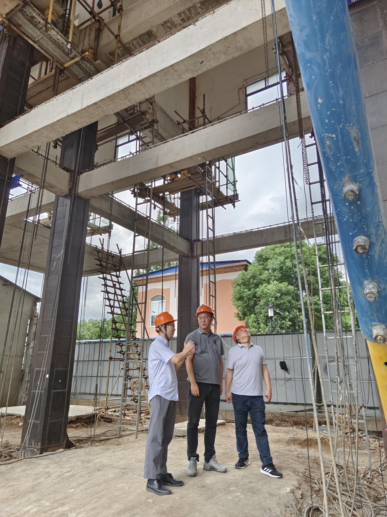 在巨成群控同步顶升工程试验项目现场,巨成周志勇介绍了工程试验的背景、目的和实施过程,双方就钢滑道顶升技术应用场景进行了深入交流和讨论。恰逢巨成开展“群控同步顶升工程试验”新闻发布会,李主任对巨成表示祝贺。