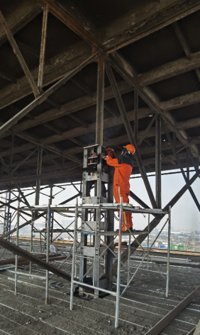 目前,项目部约有200人正紧锣密鼓地开展钢天窗架顶降的相关施工准备工作,如钢滑道安装、天窗架构件加固、纵横向支撑安装、设备安装调试等。