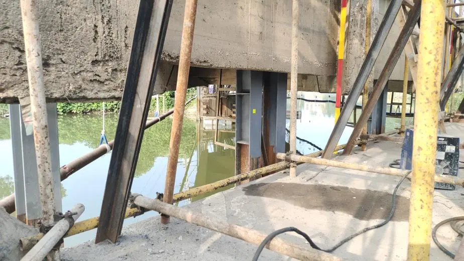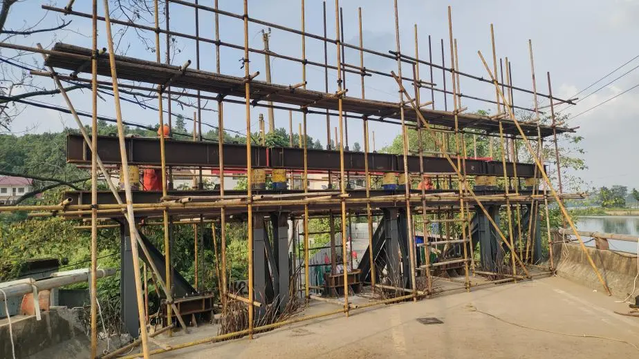 由于犬木塘水库水位已淹没河上桥梁底,水下作业面临诸多不便,难以从桥底直接对整座桥梁进行顶升。经过多轮方案研讨,最终采用钢结构支撑体系,利用高强度螺纹钢、可活动的钢梁以及巨成自主研发的集中控制同步顶升成套设备,实现整座桥梁的顶升吊起。