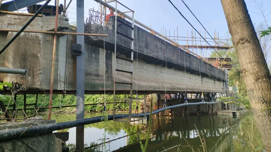 安全管控方面,项目部也做到了精准施策:采用“分段吊绳逐级放长”的方式确保河上桥两侧的光纤管、PE水管在顶升期间基本保持在原有的水平线上,实现断裂零风险。河上桥顶升完成后,进一步采取双重安全保障措施,利用48mm钢丝绳将桥段端梁与钢构体系的横梁捆绑,同时在原桥台上设置型钢立杆做好竖向支撑,确保后续桥下施作新桥墩桥台的空间安全。